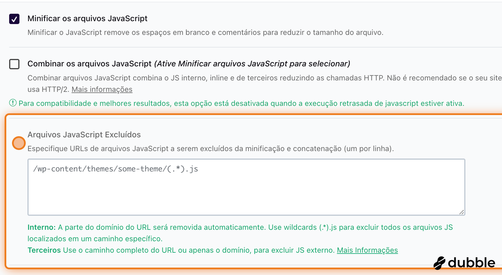 4. Se a opção de "Minificar os arquivos JavaScript" e/ou "Combinar os arquivos JavaScript" estiver ativado